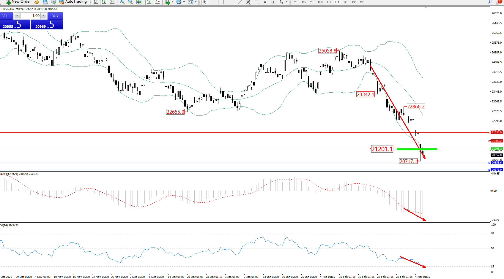 恒指HK50 ——4小时K线图显示: