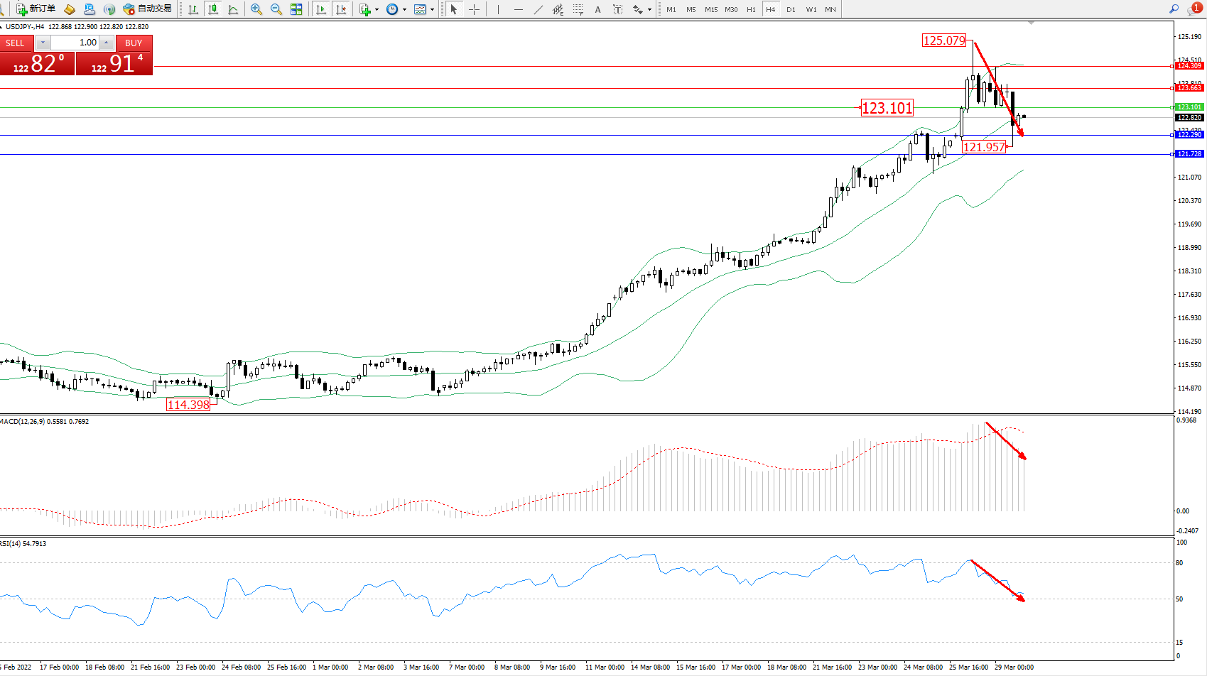 交易策略:123.101下方看跌,目标122.290、121.728
