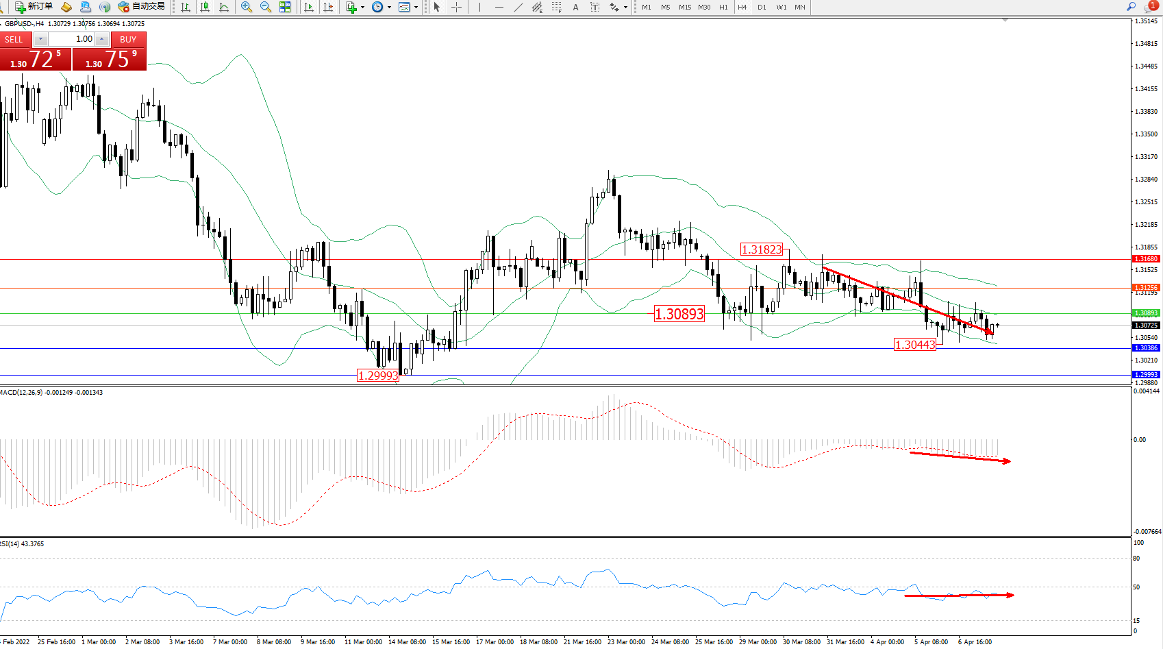 技术点评:空头动力延续布林带指标通道中下轨区间持续震荡下行,低位抵达1.30443位置节点后开始整理平移,短期空头下行趋势或将延续,布林带指标呈向下走势态势良好,MACD指标处于0轴线下方空头区域维持整理平移,RSI指标处于50均衡线下侧弱势徘徊中;