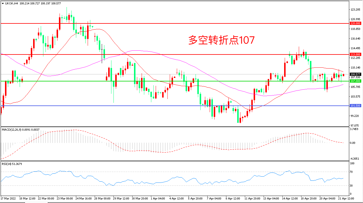 周四(4月21日),俄乌冲突交火不断,西方国家对俄罗斯石油实施禁运而引发的供应担忧进一步凸显,布伦特原油延续窄幅震荡走势,收报108.57美元/桶。目前影响油价的因素仍然纷繁复杂,地缘风险仍然是最主要因素,短期看EIA数据的超预期利多限制了油价的调整幅度,短期油价延续窄幅震荡概率较大。