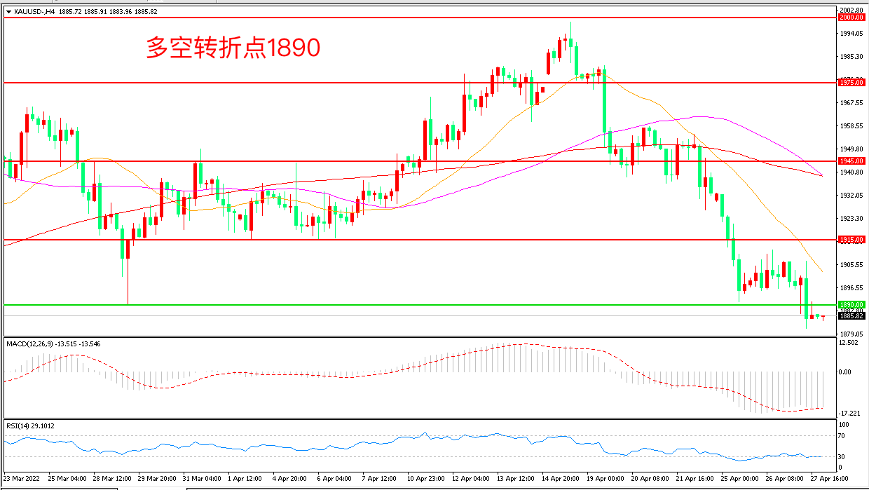 周三(4月27日),美元指数一度升破103关口,超越2020年欧美疫情爆发以来高点,现货黄金闻讯大跌,收报1885.03美元/盎司。在当前的市场环境下,美元的避险功能更被认可,从现在到下周的美联储5月FOMC公布议息政策之前,黄金恐怕难以反弹,切勿盲目抄底。