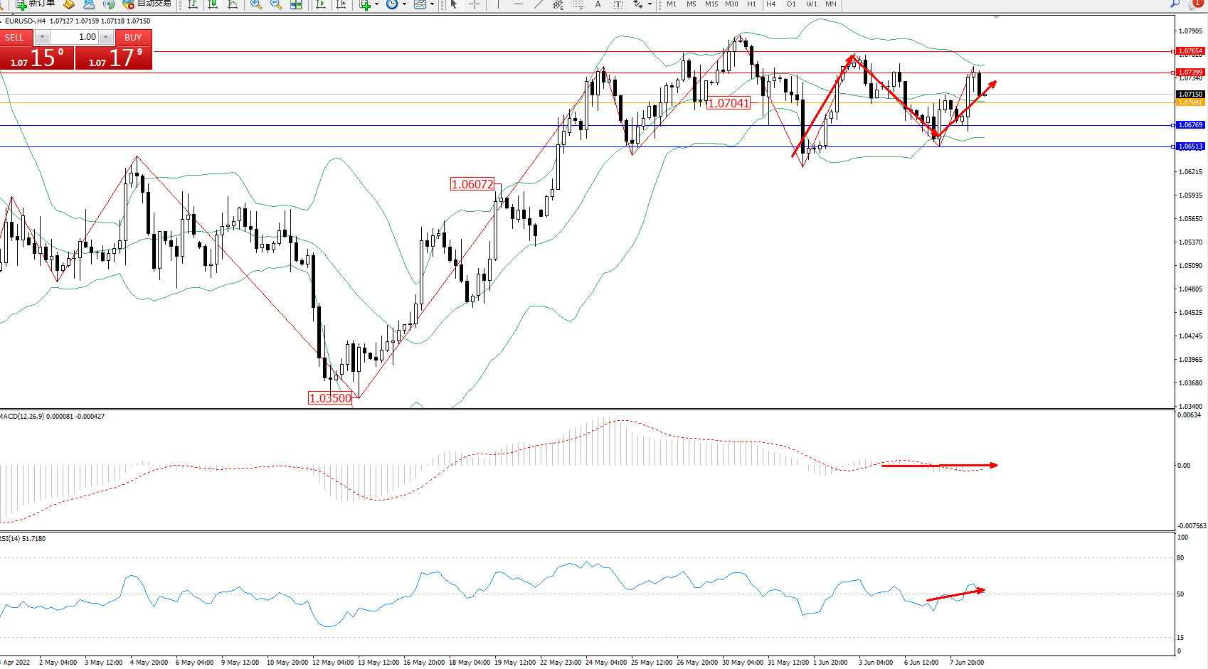 交易策略:1.07041上方看涨,目标1.07399、1.07654