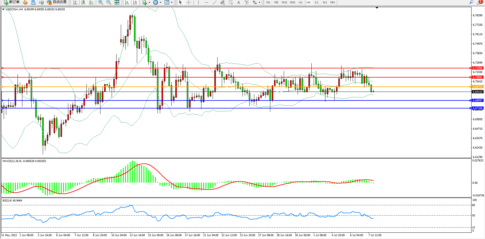 美元人民币USDCNH——4小时K线图显示: