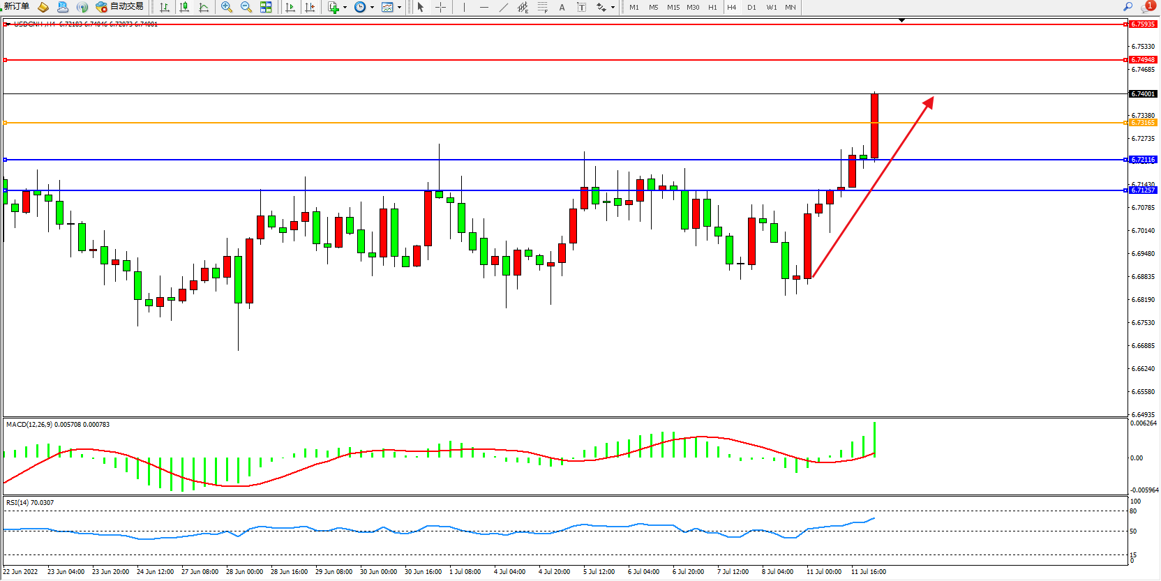 美元人民币USDCNH——4小时K线图显示: