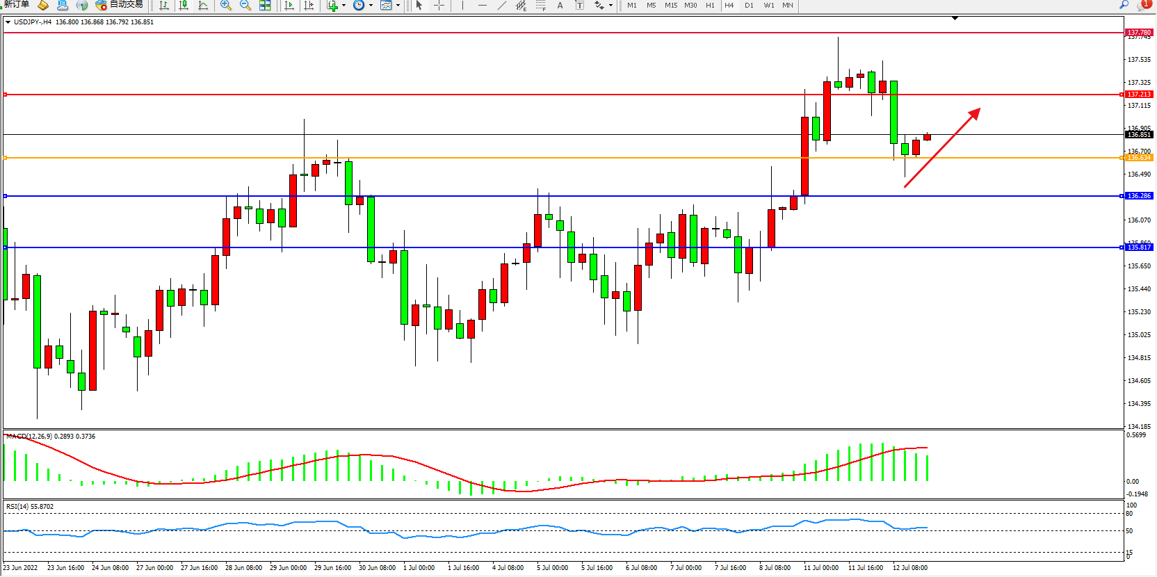 交易策略:136.634上方看涨,目标137.213、137.780