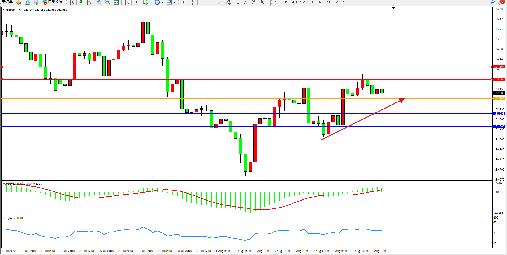 交易策略:162.748上方看涨,目标163.569、164.104