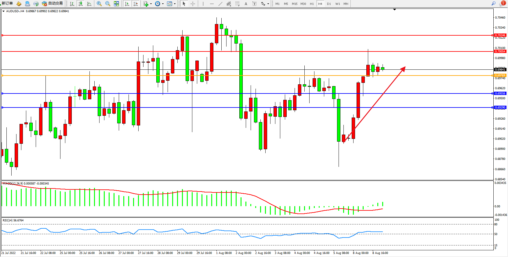 交易策略:0.69769上方看涨,目标0.70054、0.70246