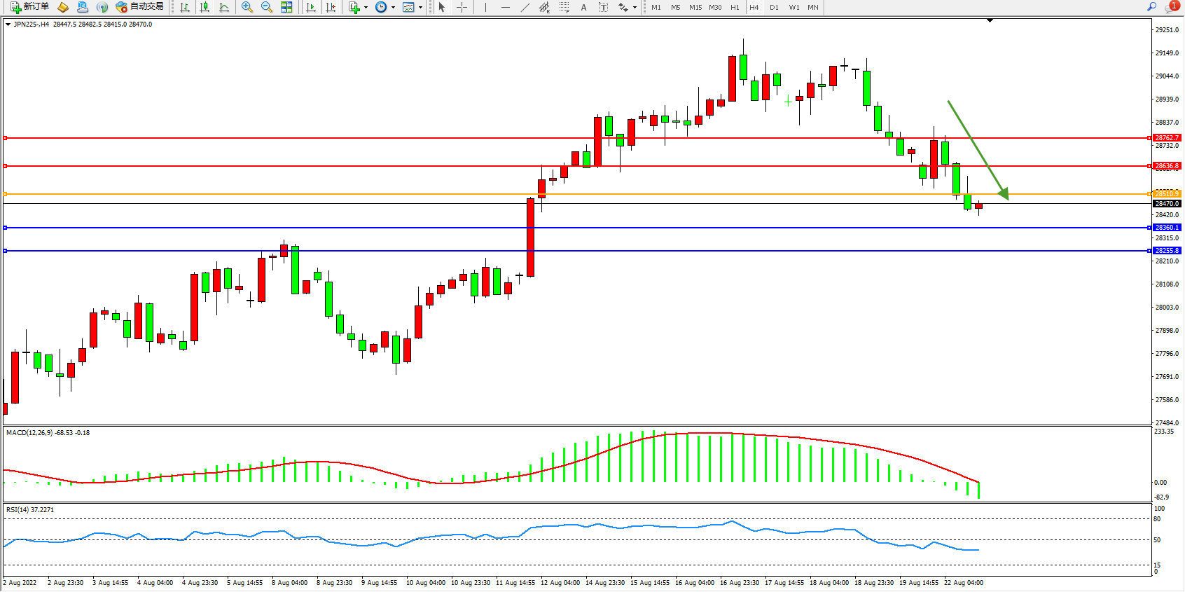 日经225指数8月22日(周一)收盘下跌157.33点,跌幅0.54%,报28773.00点,日本首相岸田文雄政府的支持率下降了16个百分点,至36%,为去年10月其上任以来的最低水平。岸田文雄政府的支持率下降可能会加剧人们对日本重返2006年-2012年“旋转门”时代的担忧,当时日本东证指数一度暴跌45%。
