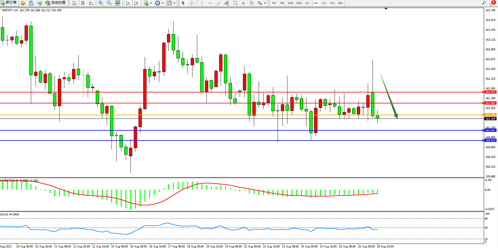 备选策略:161.393上方看涨,目标161.664、161.915