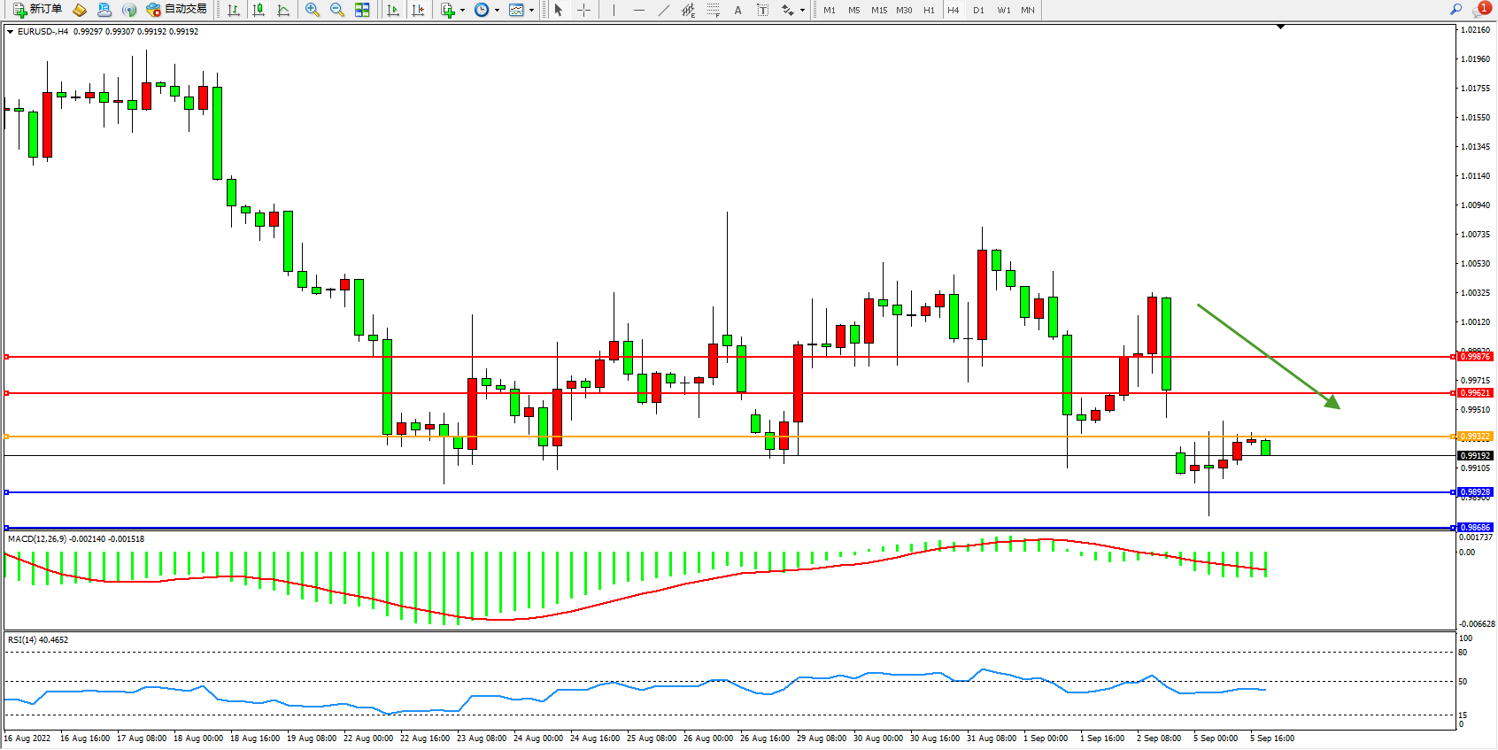 交易策略:0.99322下方看跌,目标0.98928、0.98686