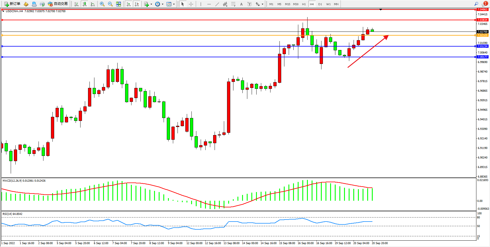 美元人民币USDCNH——4小时K线图显示: