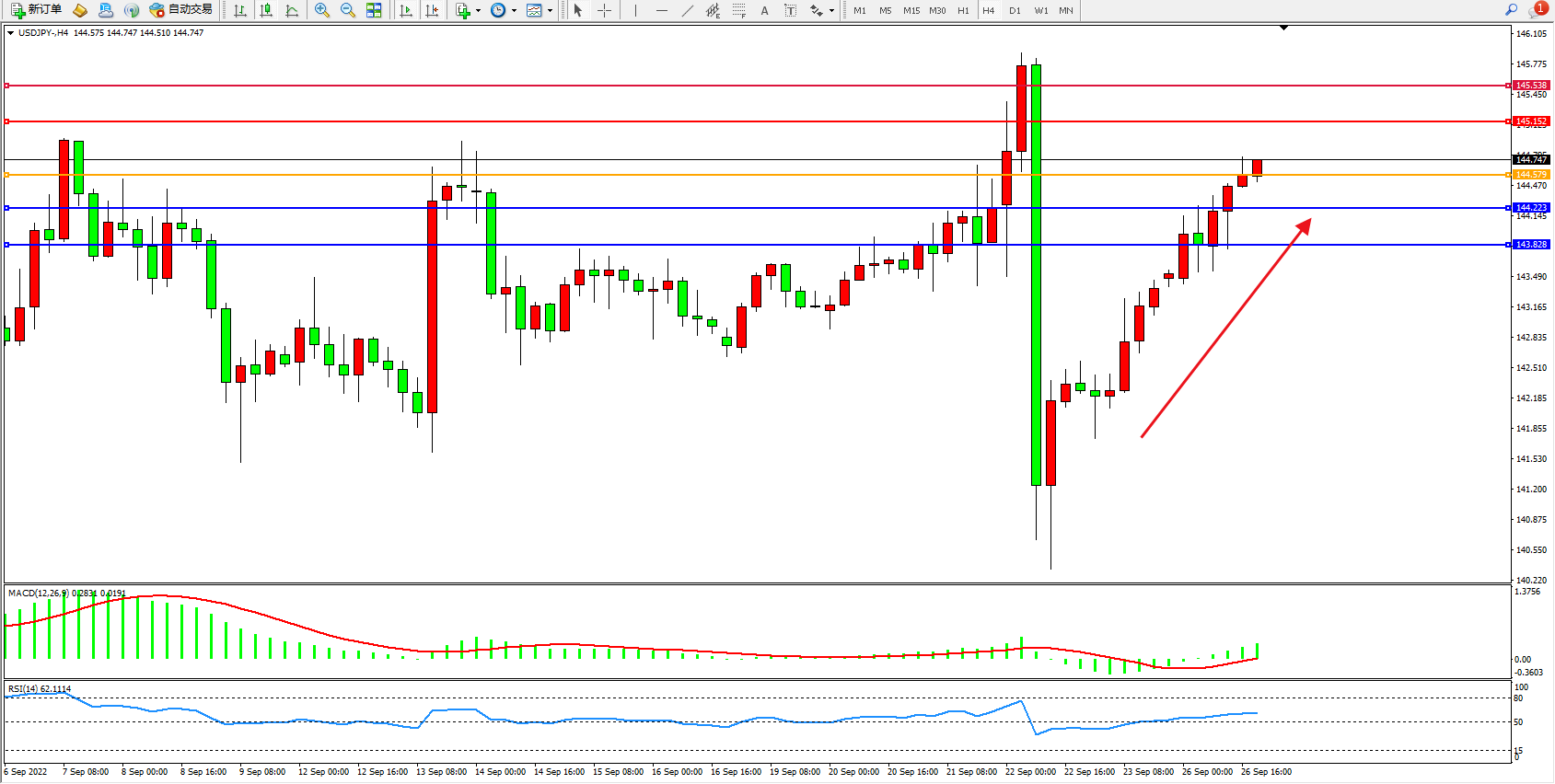 美元兑日圆维持144.747附近震荡,日本央行行长黑田东彦:央行将维持宽松的货币条件,以支持企业,日本央行正致力于实现积极的经济周期,工资、企业利润上升,通货膨胀适度加速,预计日本的消费将温和增长。