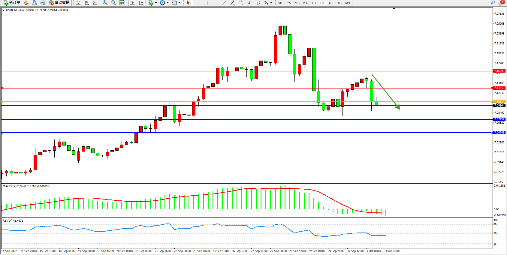 美元人民币USDCNH——4小时K线图显示: