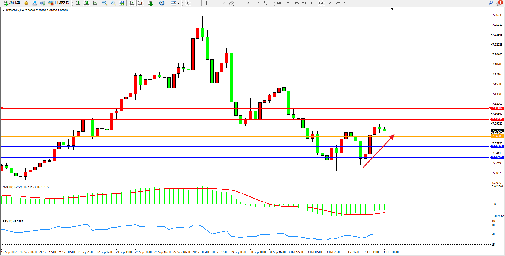 美元人民币USDCNH——4小时K线图显示: