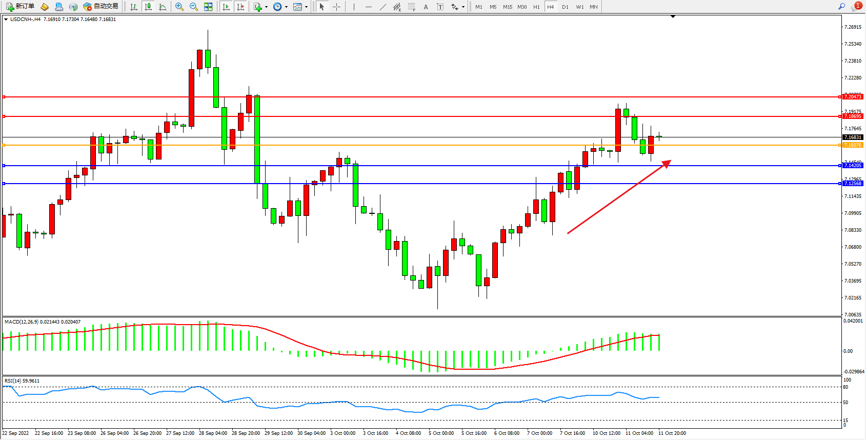 美元人民币USDCNH——4小时K线图显示: