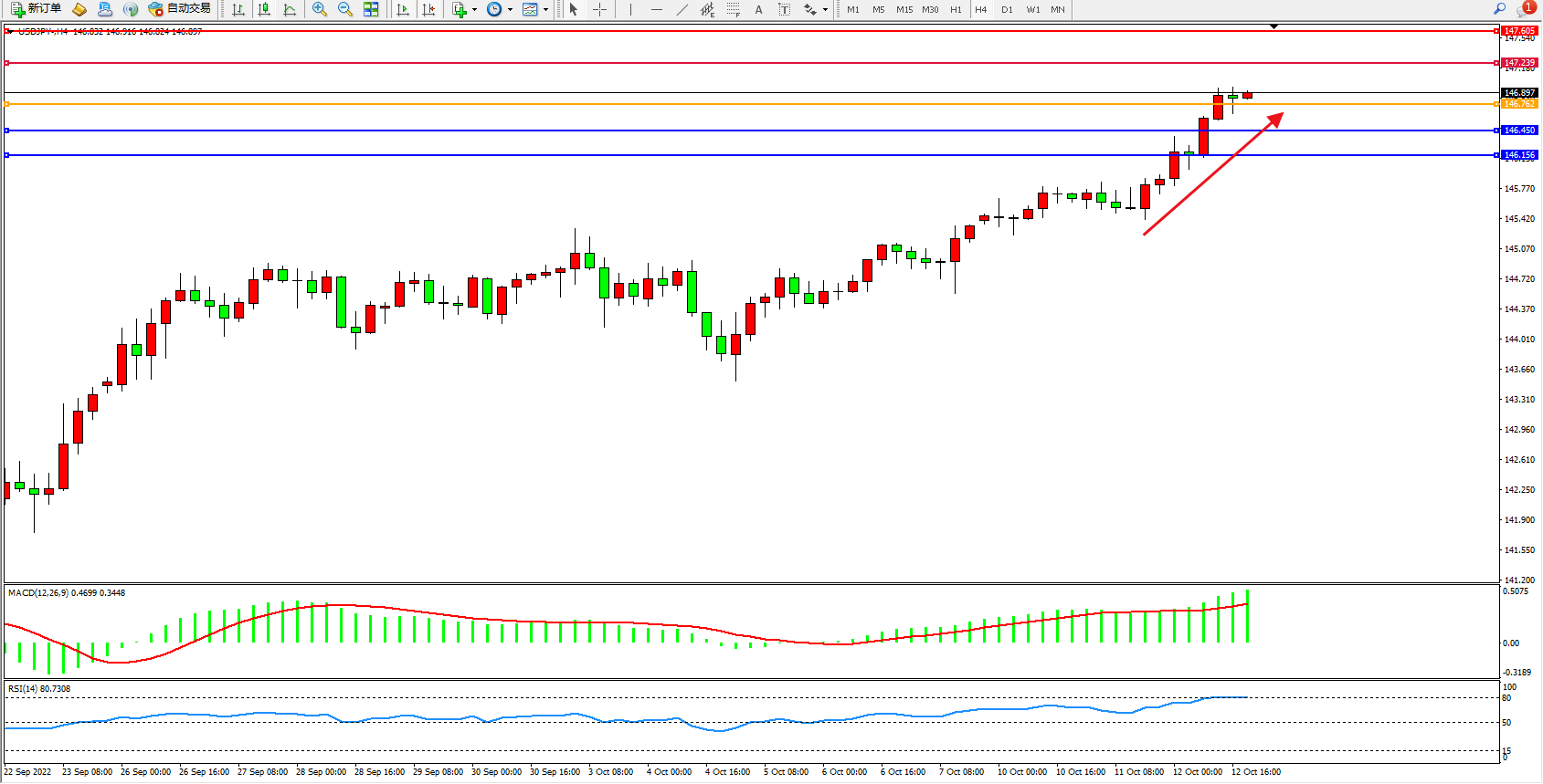 美元日圆USDJPY——4小时K线图显示: