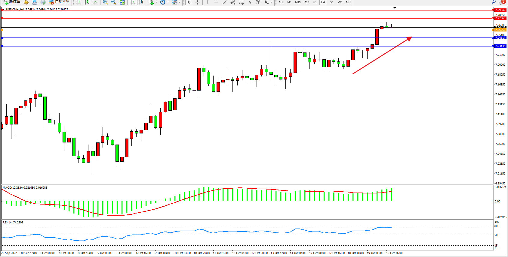 美元人民币USDCNH——4小时K线图显示: