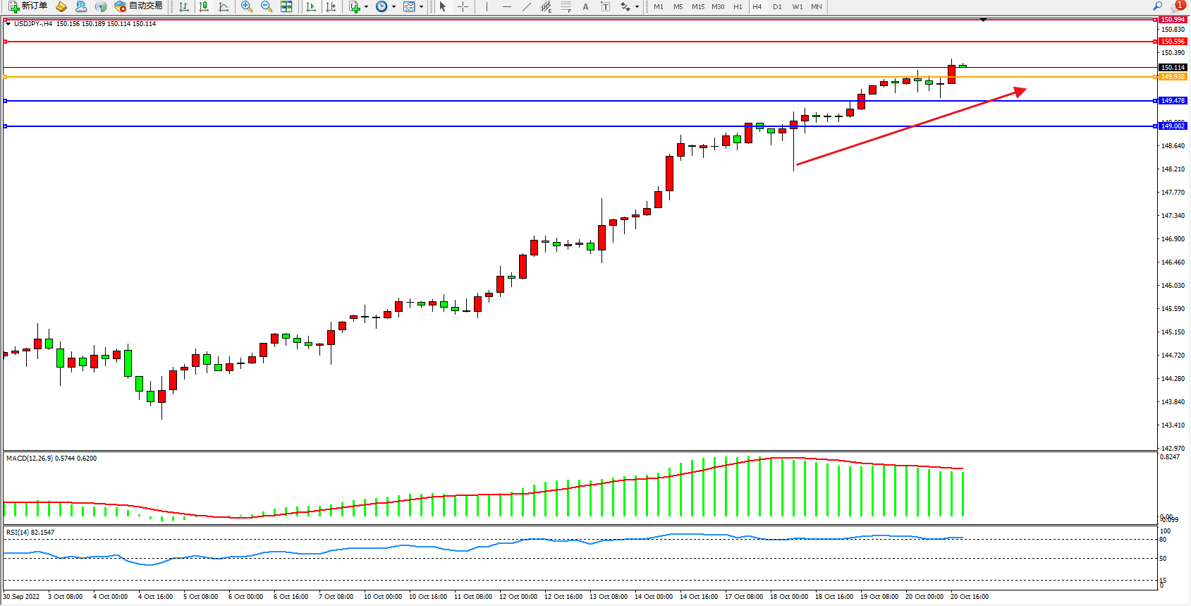美元日圆USDJPY——4小时K线图显示: