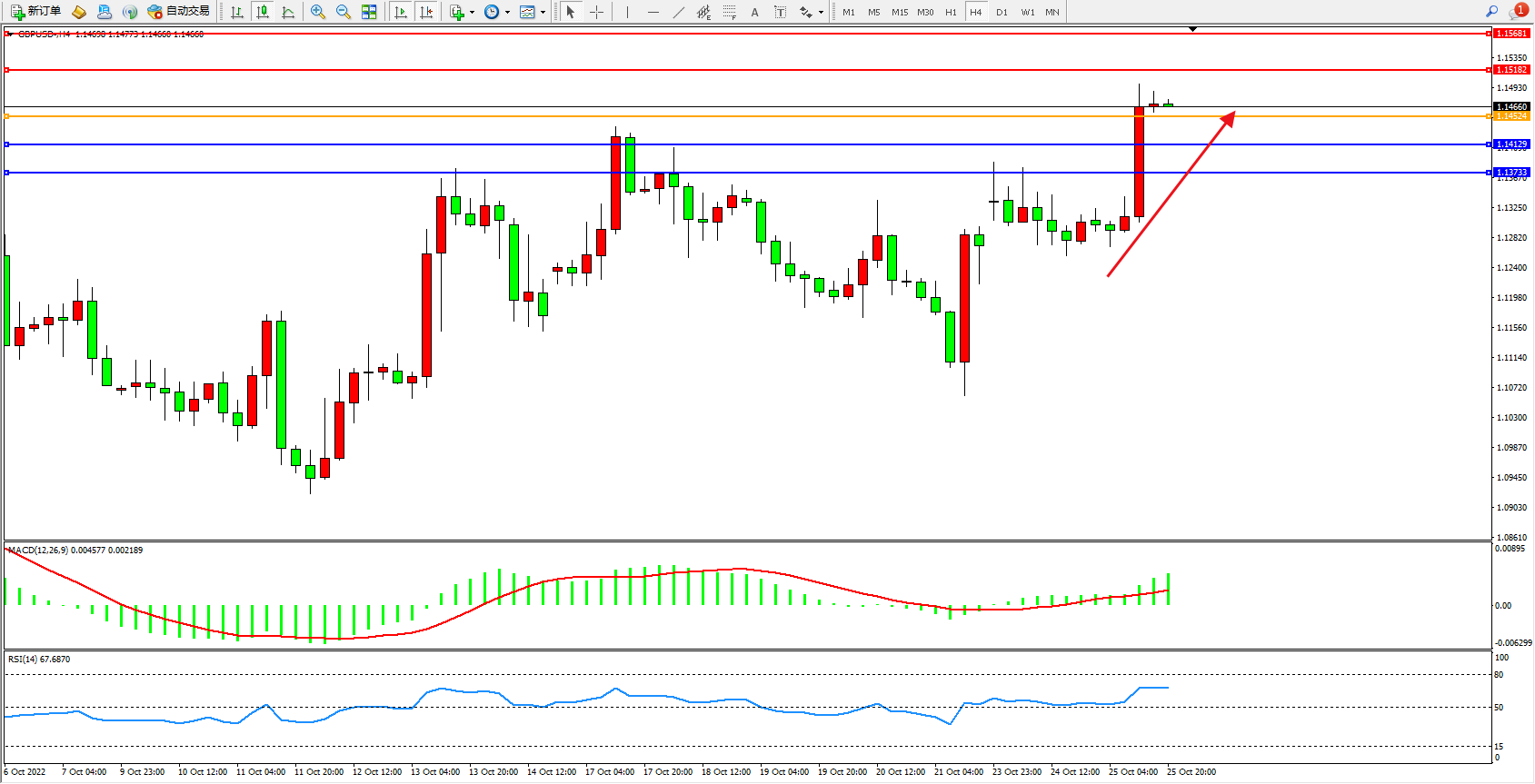 交易策略:1.14524上方看涨,目标1.15182、1.15681