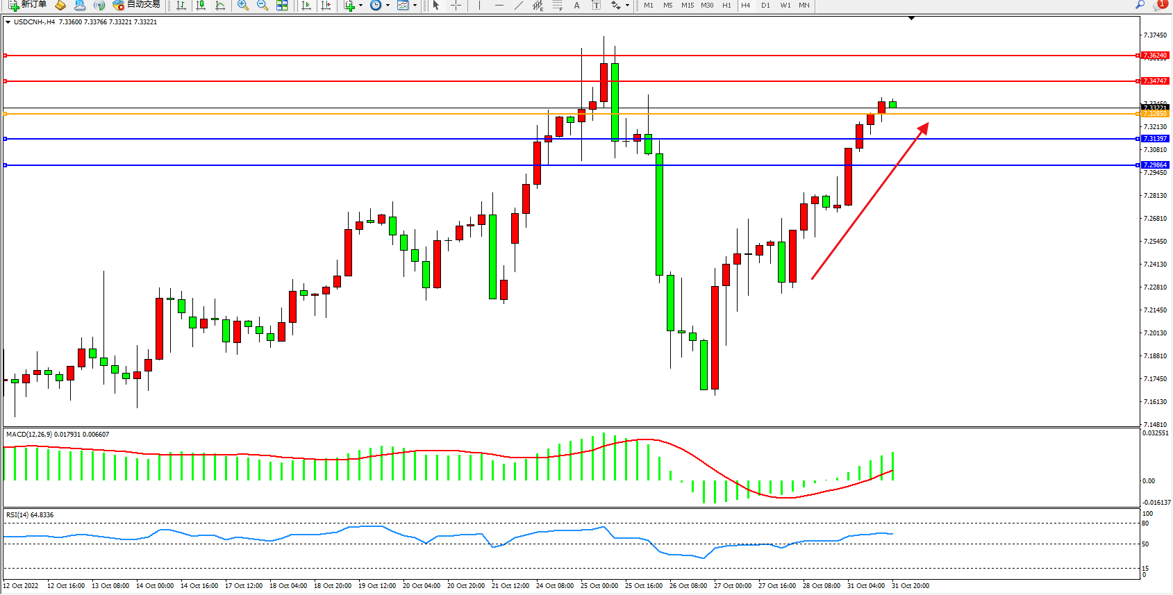 美元人民币USDCNH——4小时K线图显示: