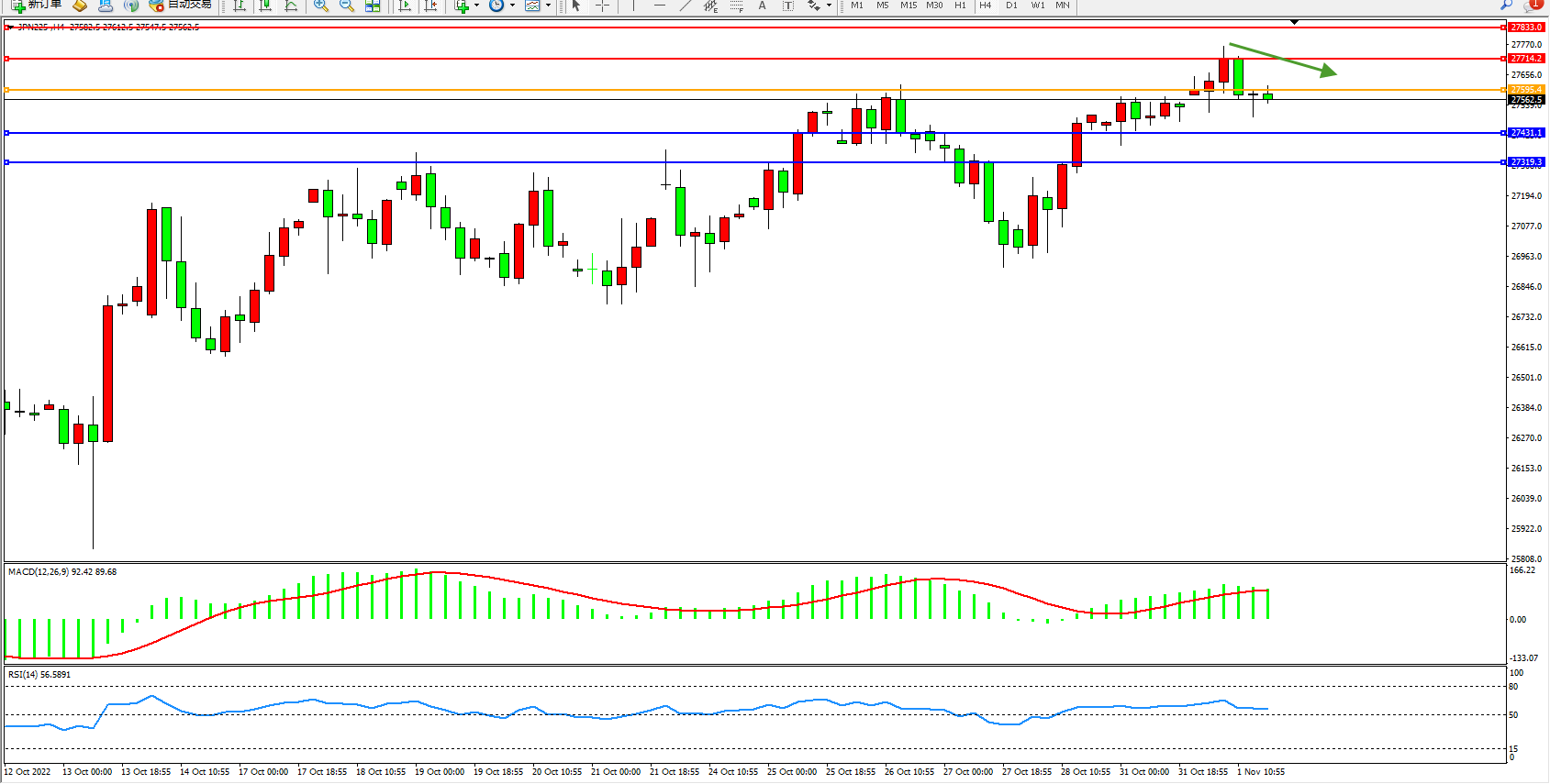日经指数JPN225——4小时K线图显示: