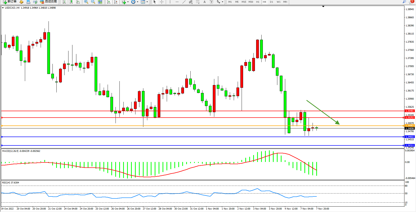 美元加元USDCAD——4小时K线图显示: