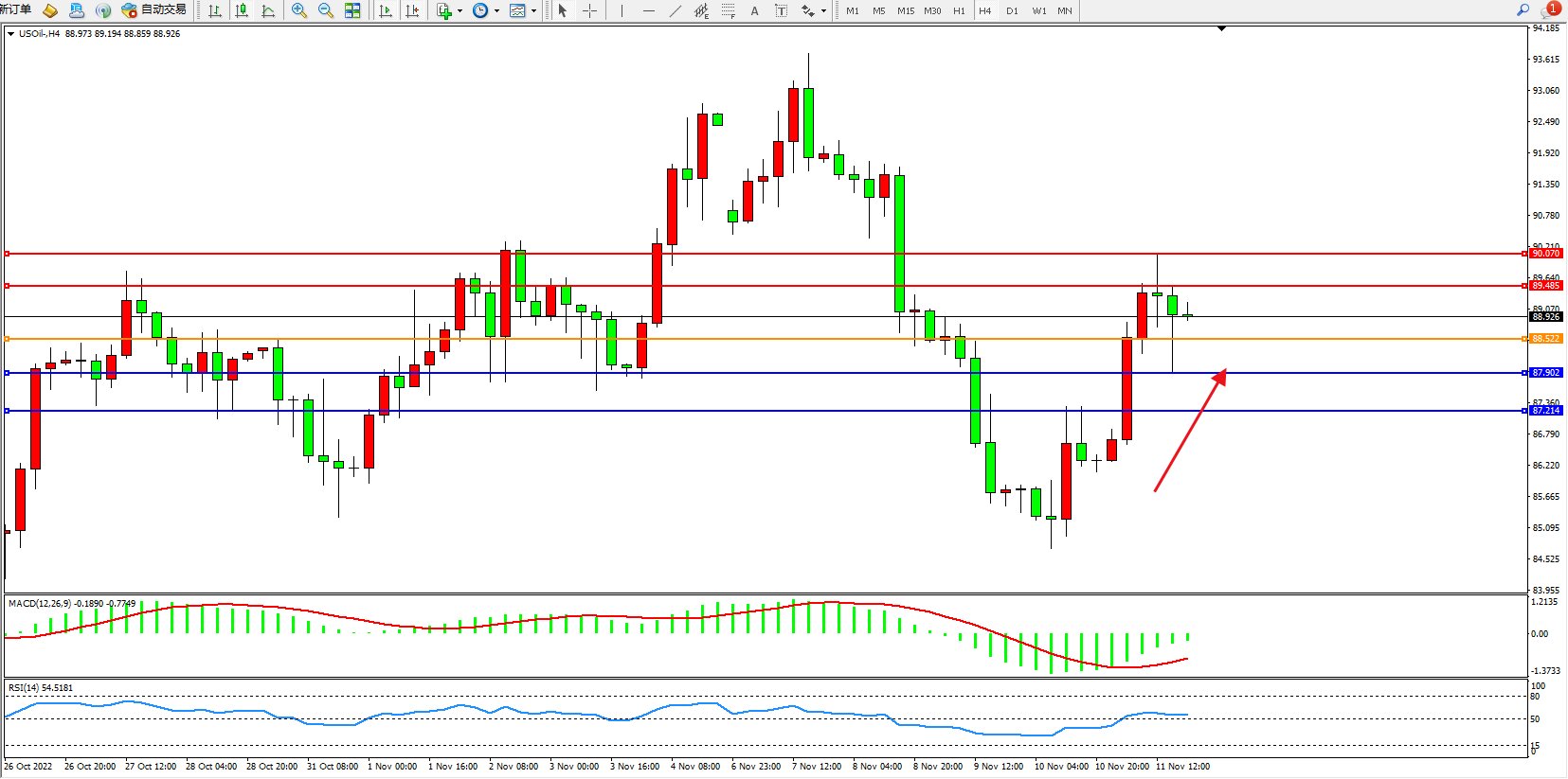 交易策略:88.522上方看涨,目标89.485、90.070