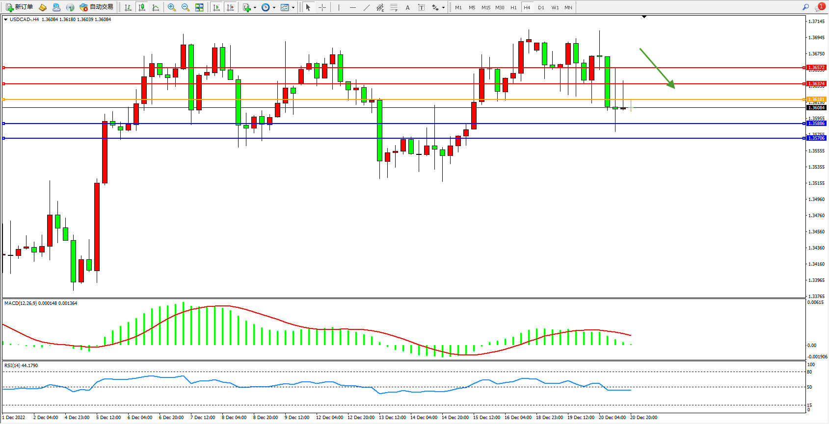 美元加元USDCAD——4小时K线图显示: