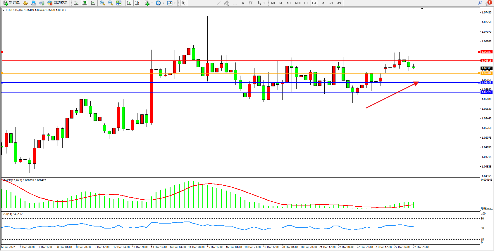 欧元美元EURUSD—4小时K线图显示: