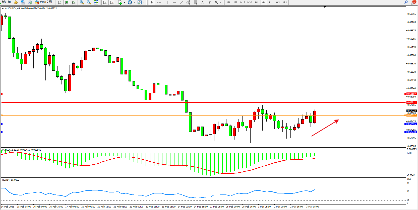 交易策略:0.67617上方看涨,目标0.67911  0.68107