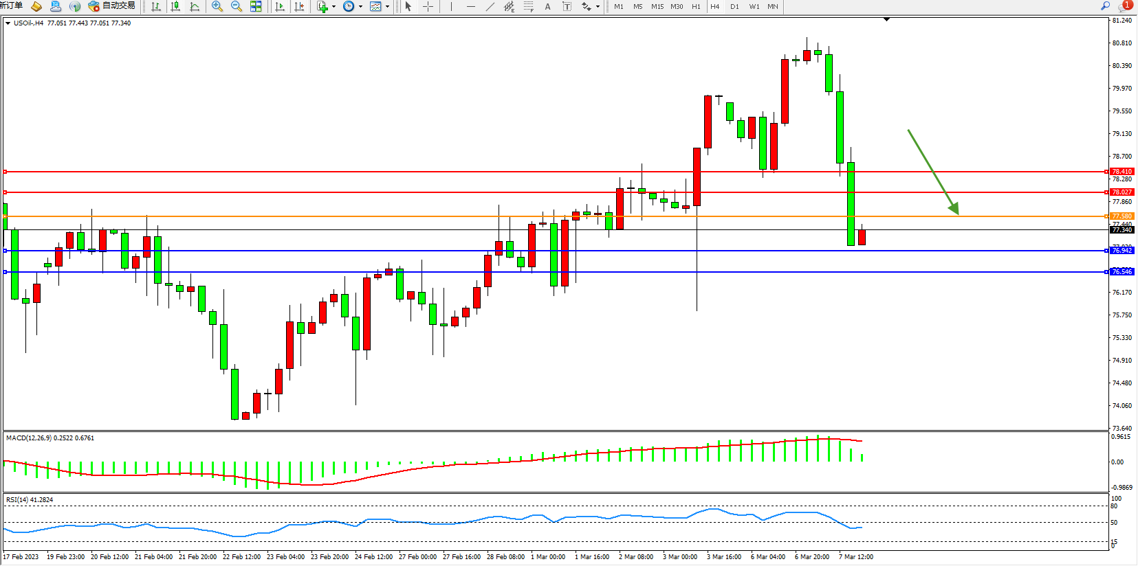 交易策略:77.580下方看跌,目标76.942  76.546