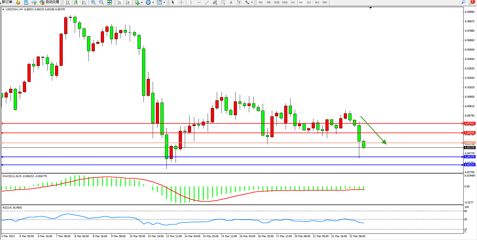 美元人民币USDCNH——4小时K线图显示: