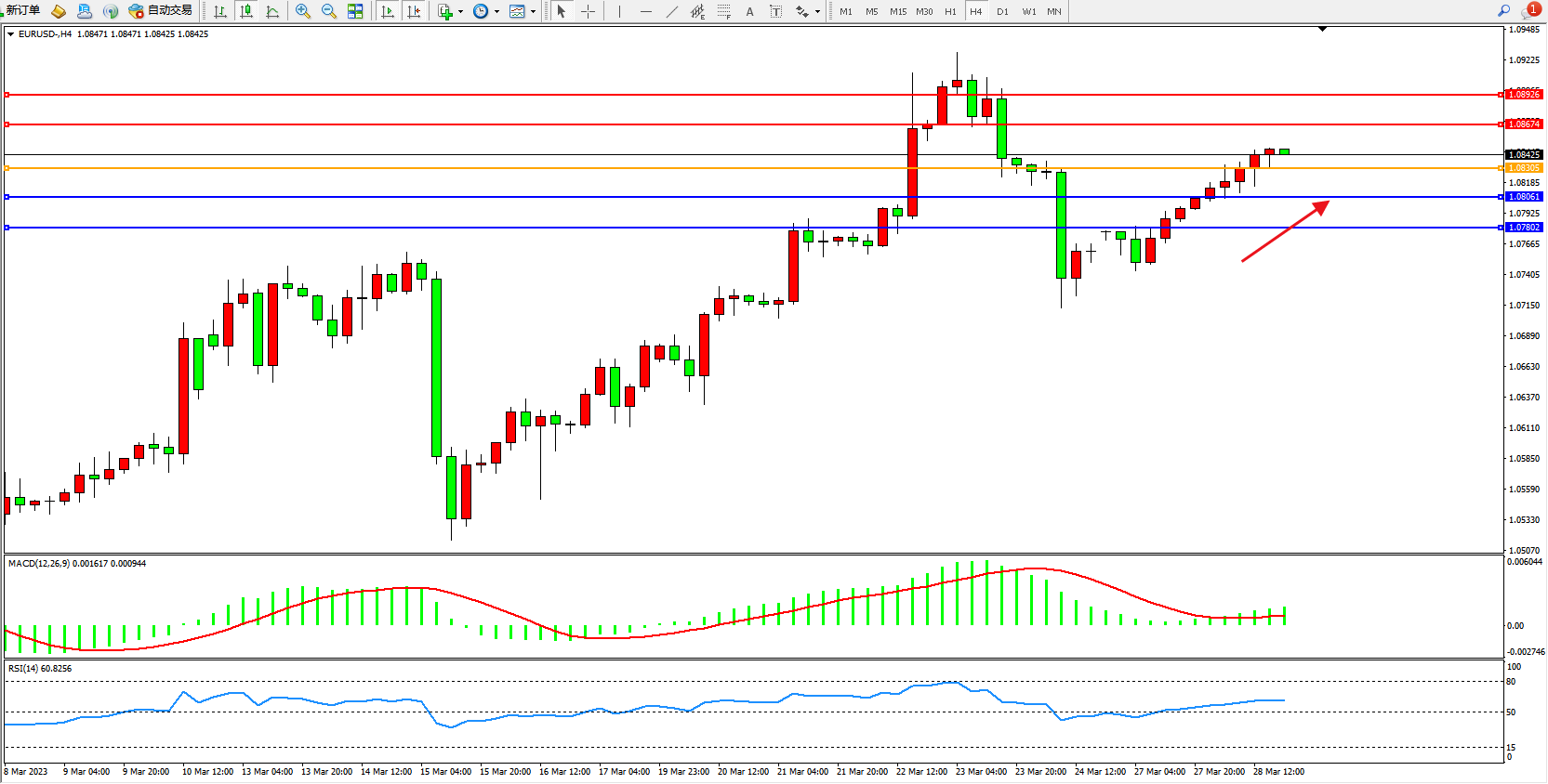 欧元美元EURUSD—4小时K线图显示: