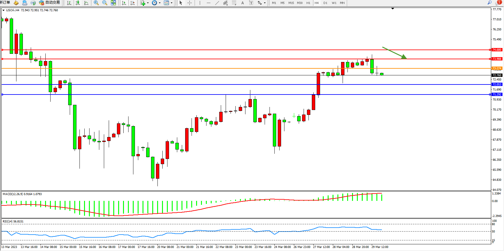 交易策略:73.274下方看跌,目标72.053  71.292