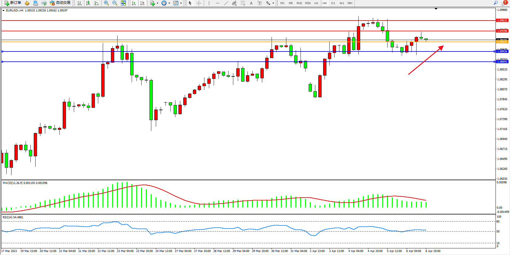 支撑位:1.08926 1.08693