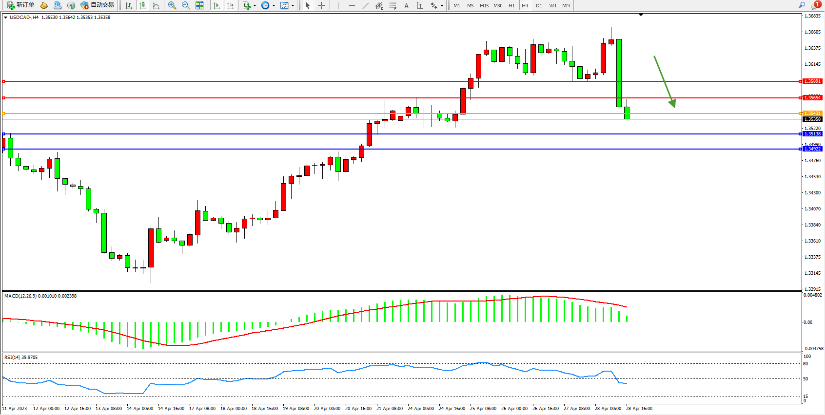 美元加元USDCAD——4小时K线图显示: