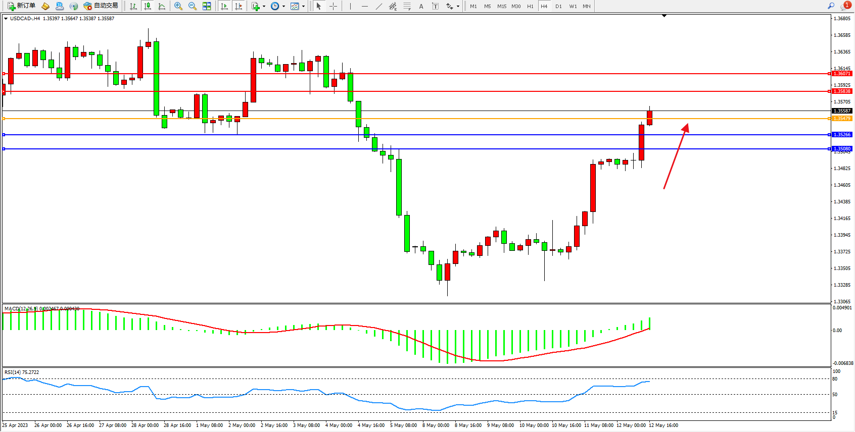 美元加元USDCAD——4小时K线图显示:
