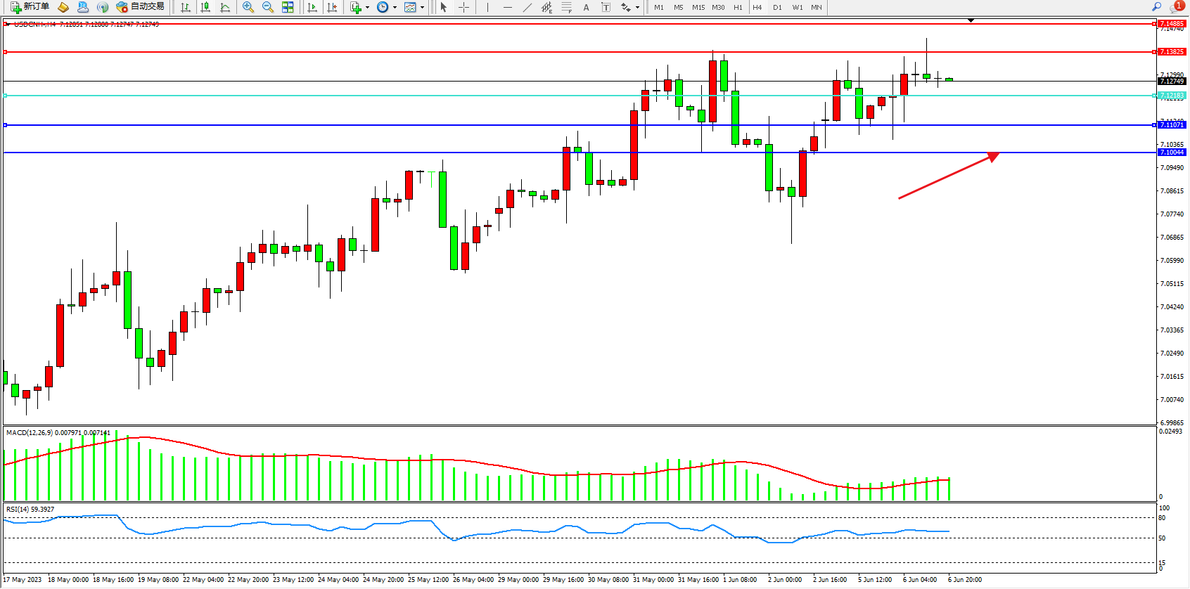 交易策略:7.12083上方看涨,目标7.13825  7.14885