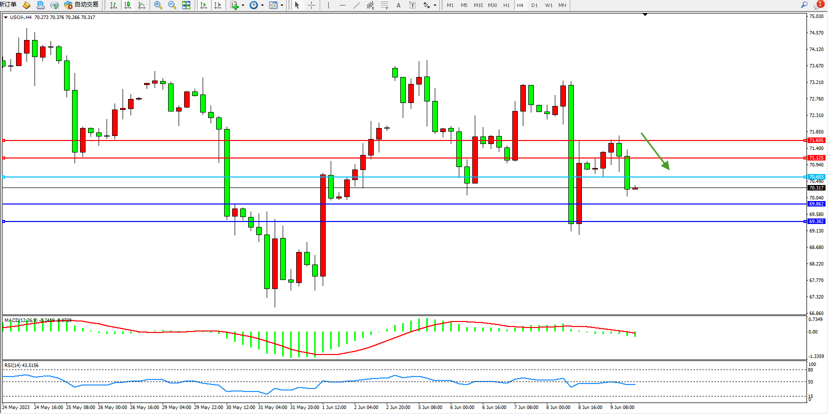 交易策略:70.603下方看跌,目标69.862  69.382