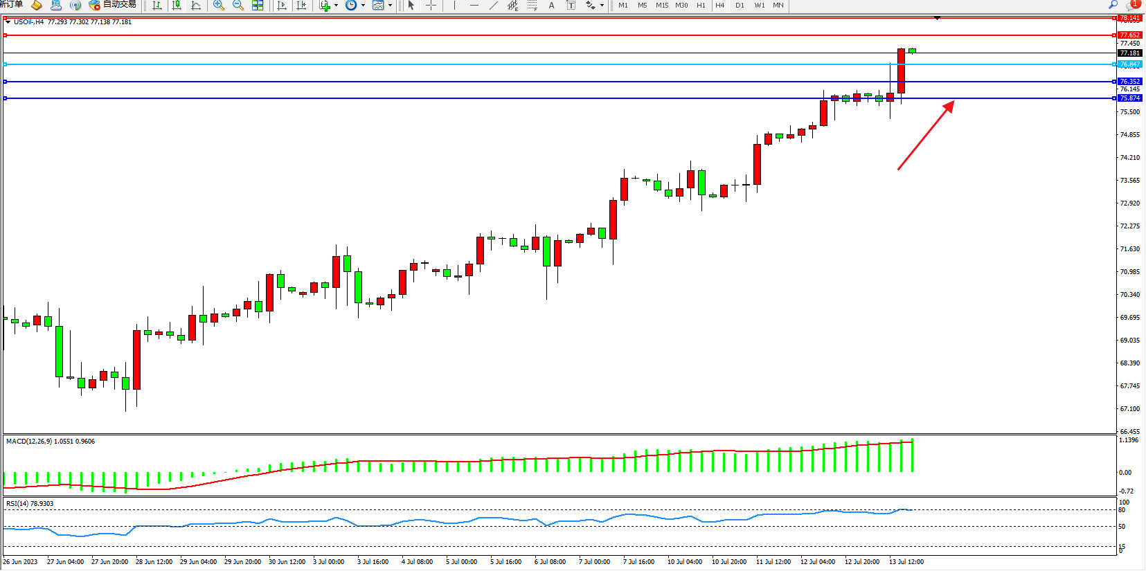 原油USOil——4小时K线图显示: