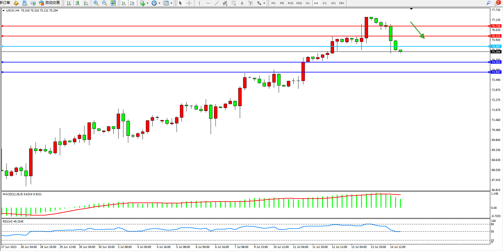 交易策略:75.507下方看跌,目标74.553 73.947