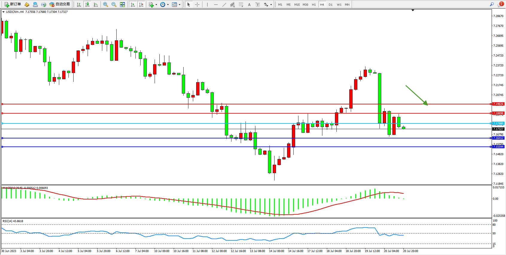 交易策略:7.17880下方看跌,目标7.16412  7.15544