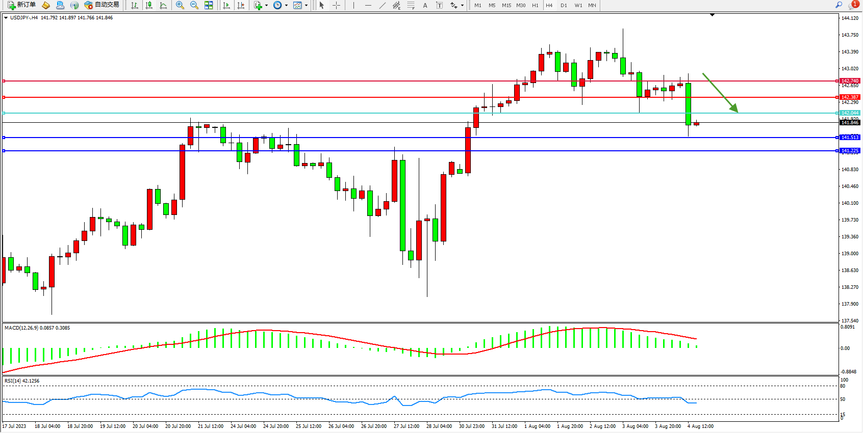 交易策略:142.044下方看跌,目标141.513 141.225