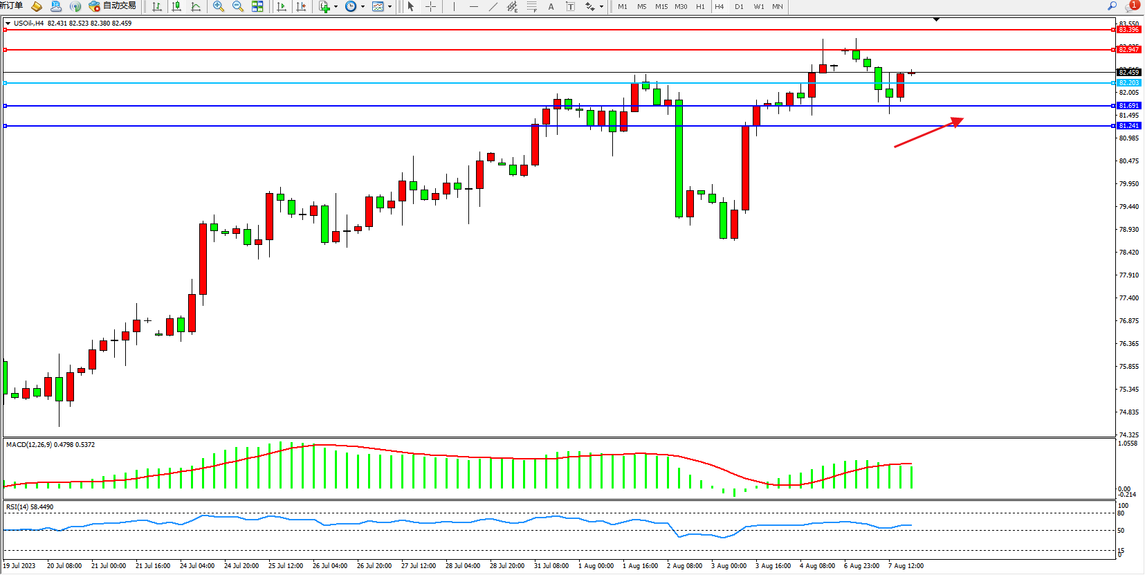原油USOil——4小时K线图显示: