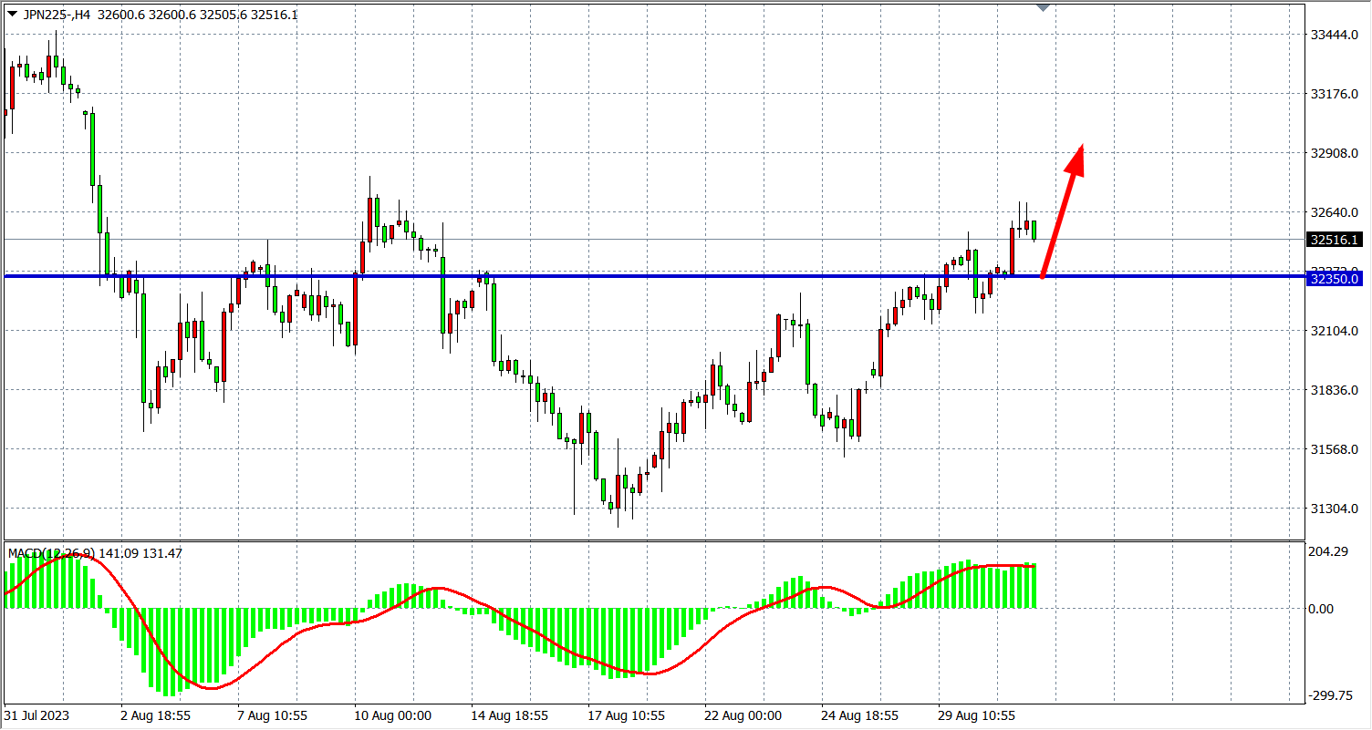 4小时图看,日经指数继续走高至32500之上,MACD量能在零轴上维持均匀,阻力继续关注32500附近,支撑关注32350附近。