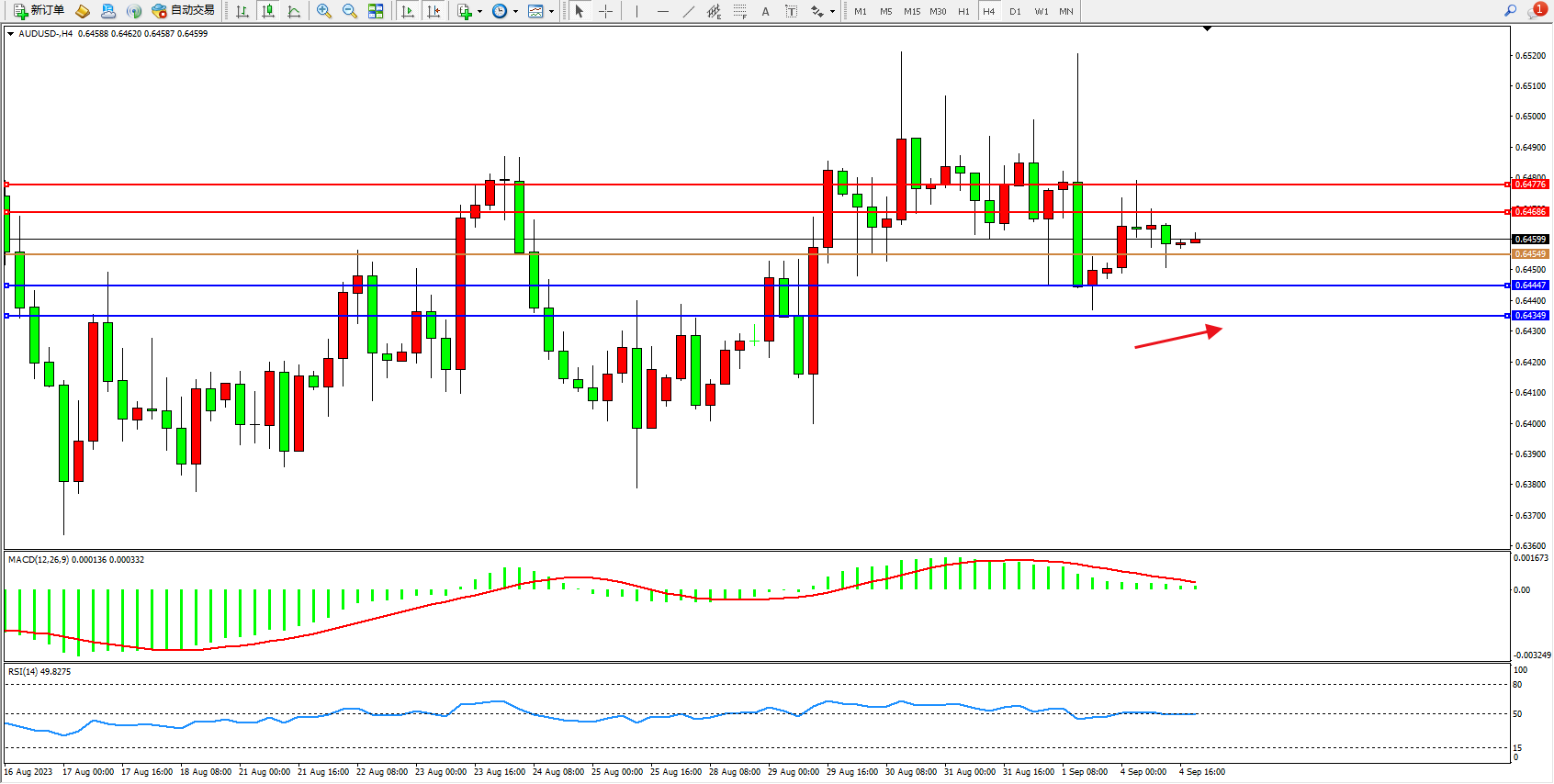 交易策略:0.64549上方看涨,目标0.64686 0.64776