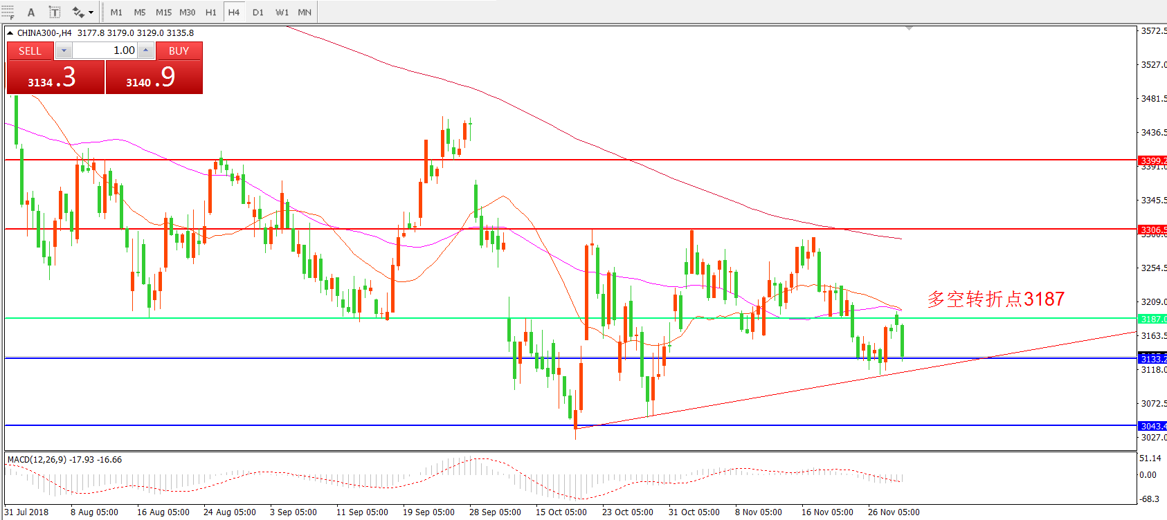 4 小时图看,CHINA300中华指数冲击多空转折点3187后未能突破上行,掉头下行,回落于下方支撑3124附近,均线逐渐粘合形成双重阻力,短期内价格依然以震荡走势为主。