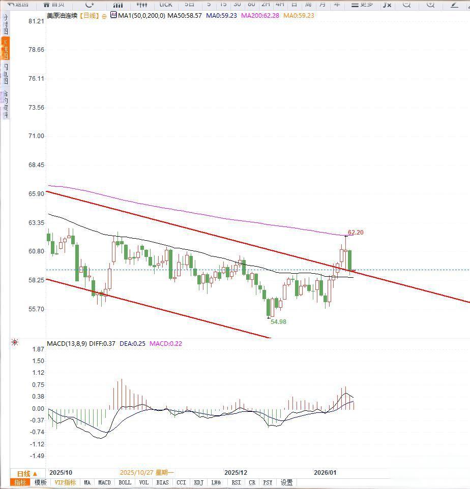 关键支撑位集中在58.80—59.00美元区域,该位置为前期平台与60日均线交汇处,若有效跌破,下一目标可能指向56.50美元;上方阻力则位于60..0美元与62.00美元。整体来看,日线级别已转为震荡偏空结构,短期反弹更可能被视为修复性行情。