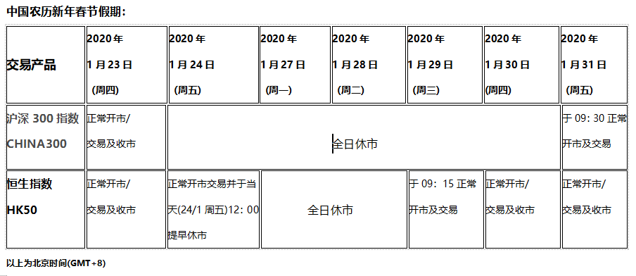 由于中国农历新年春节假期和美国马丁路德金纪念日假期影响,以下交易产品的交易时间将因假期提早或全日休市,敬请阁下留意知悉!