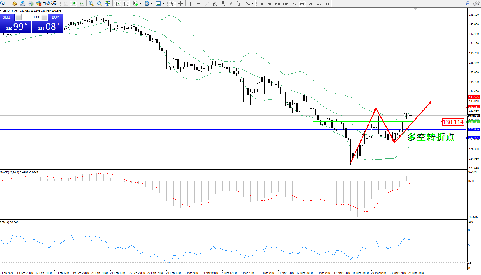 交易策略:130.114上方看涨,目标132.231、133.575